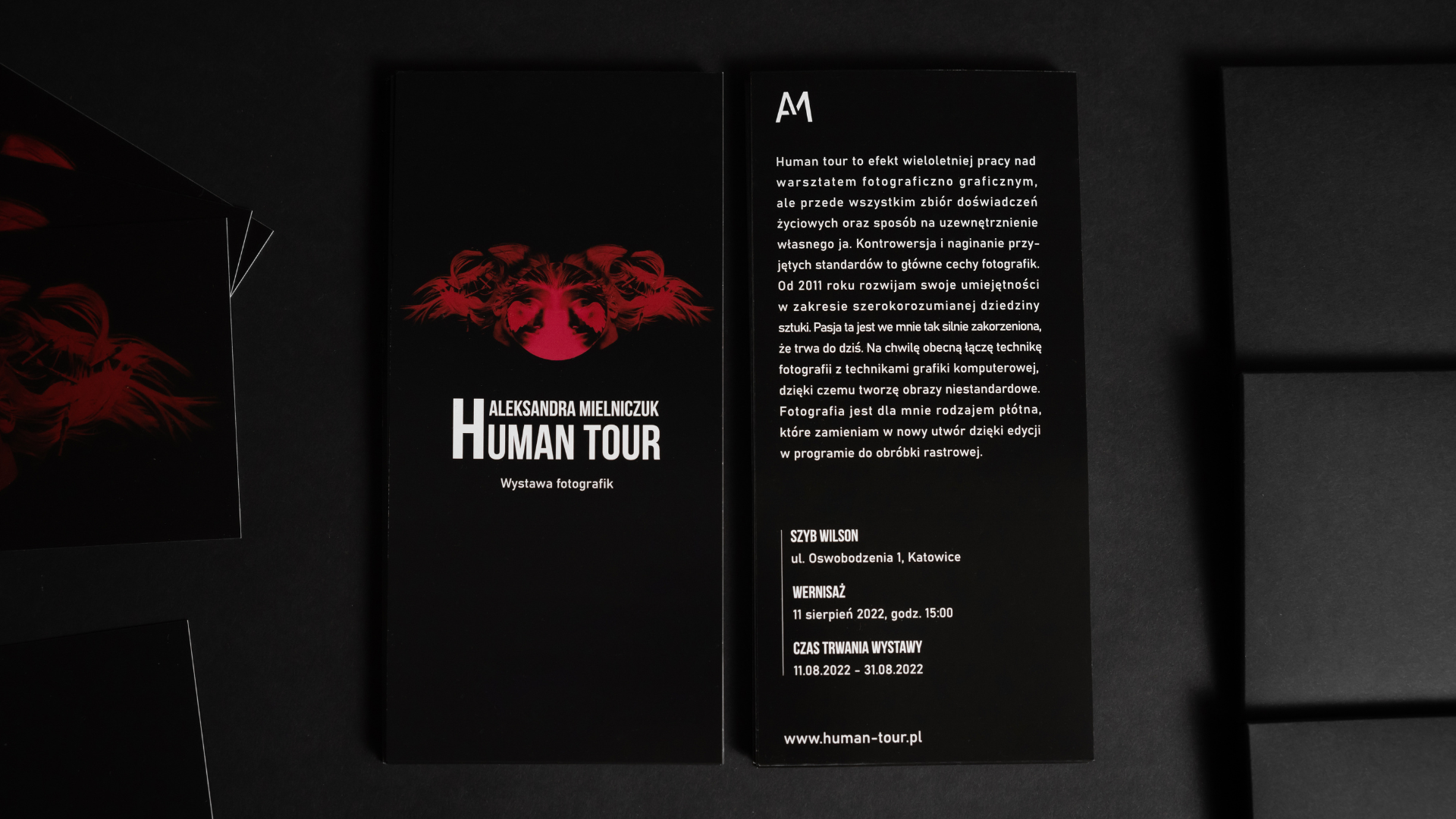 Moja praca dyplomowa przewidywała realizację wystawy samodzielnie zrealizowanych fotografik, pt. „Human tour” oraz jej oprawę graficzną, czyli wykonanie materiałów promocyjnych drukowanych, takich jak ulotki, plakaty, zaproszenia, bilety wstępu, informacyjną stronę internetową odnośnie realizacji wystawy oraz krótki film promujący.